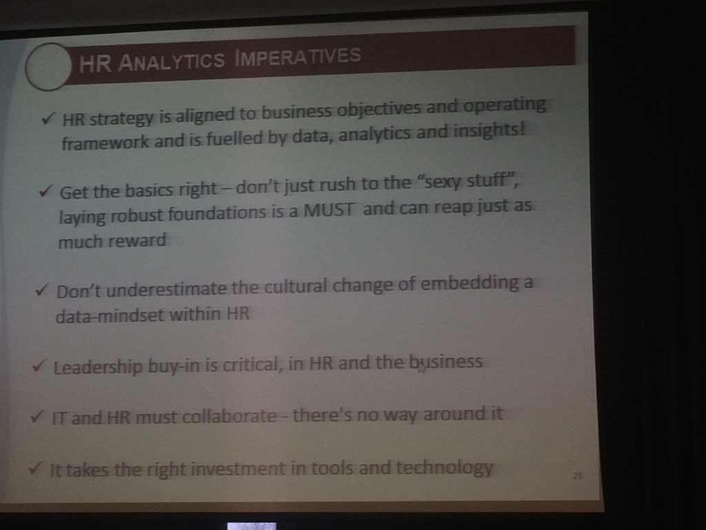 During Sally Dillon’s presentation she described the HR analytics role as “kill complexity, never rest, care more, create legacy” and reminded us that “we own definition, methodology and tools – we don’t own the data, the business leaders own the data“…